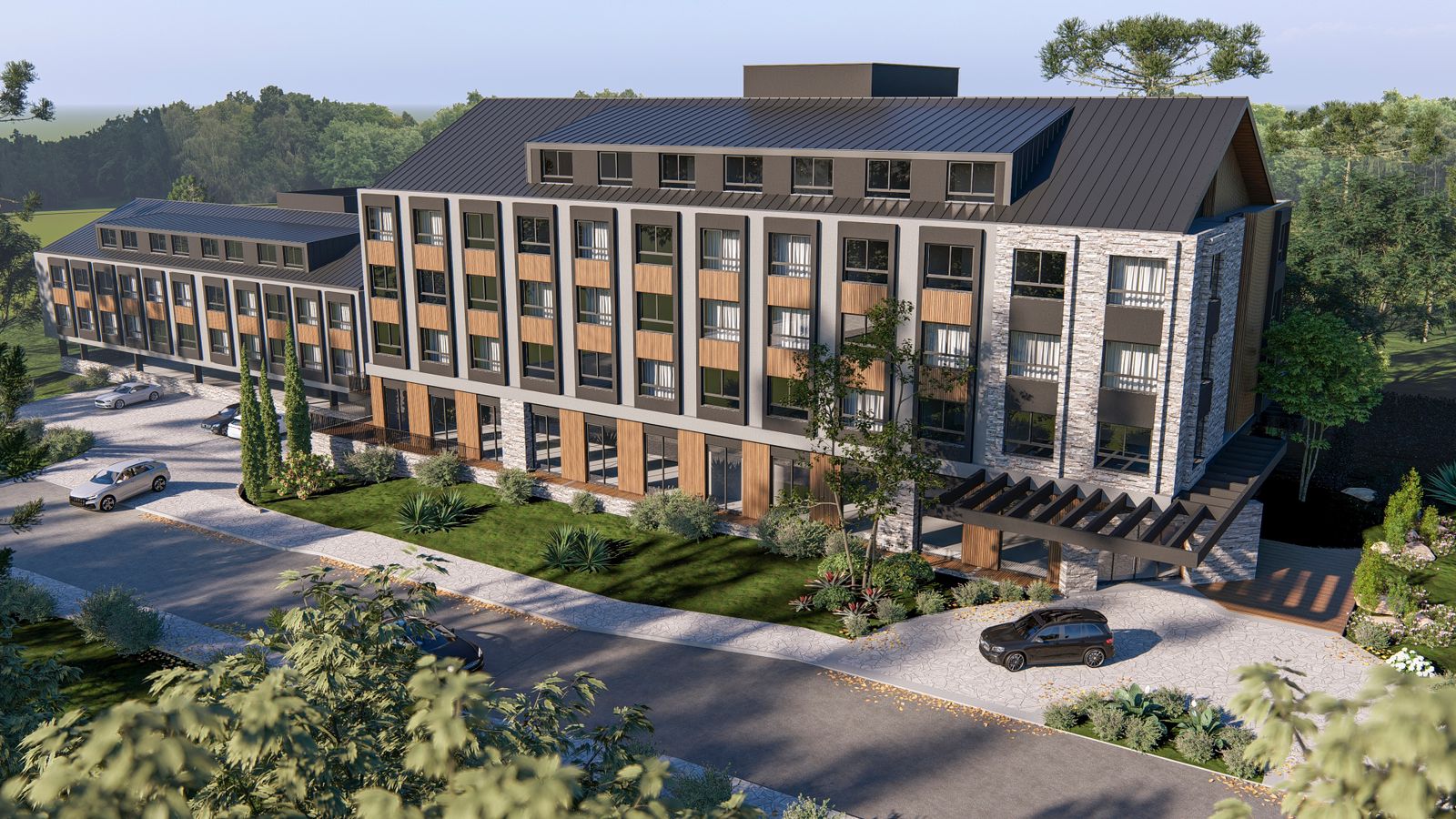 Projeto desenvolvido em função da demanda local, respeitando a arquitetura da Região da Hortênsias e o programa de necessidades que um hotel necessita.